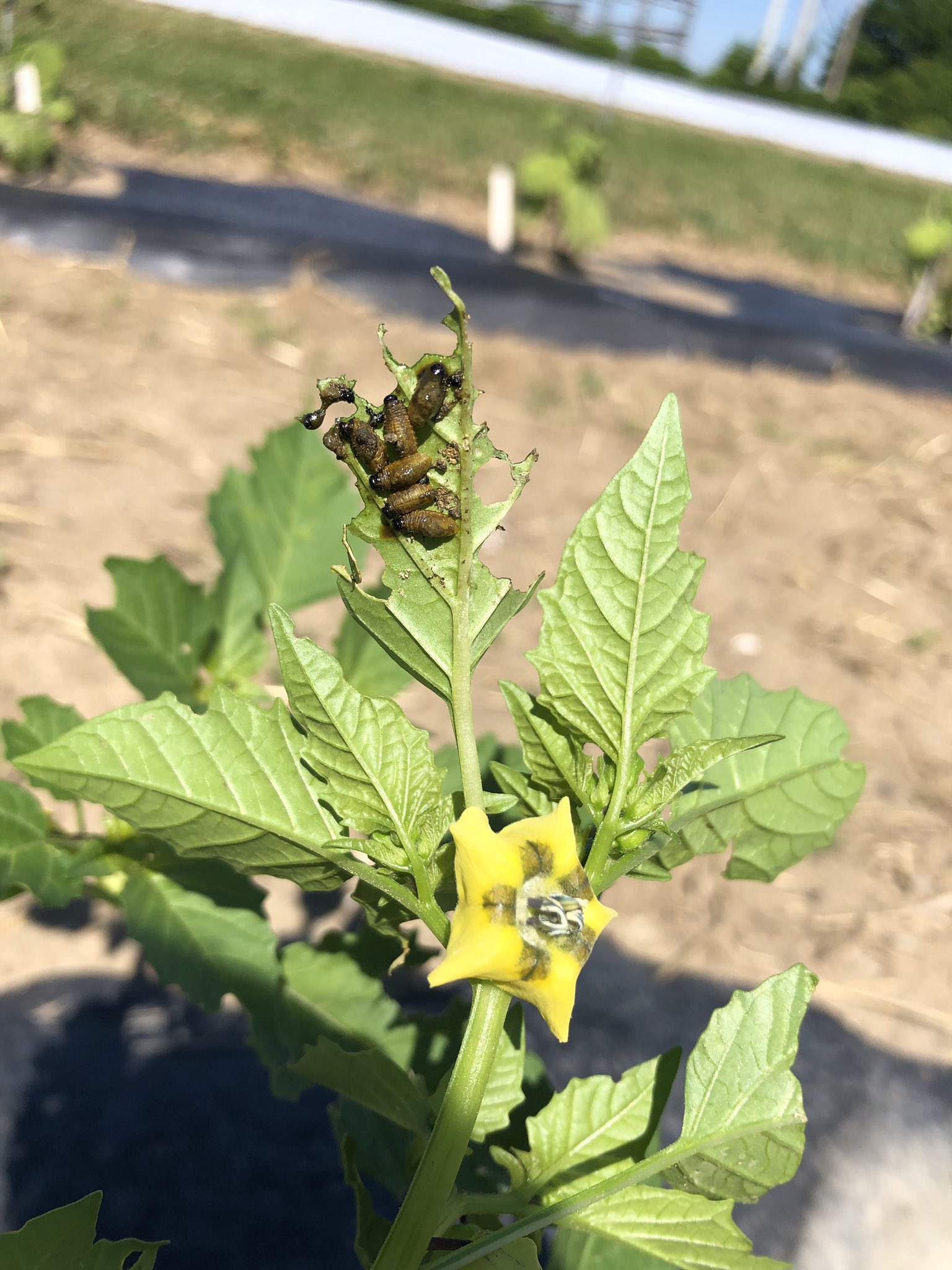 Even though some of the leaves are yellows they still look healthy. In the absence of garden hosts they will feed on weeds such as buffalo-bur and ground cherry. Colorado potato beetles feed on the leaves and can cause severe defoliation of infested plants Figure 1.